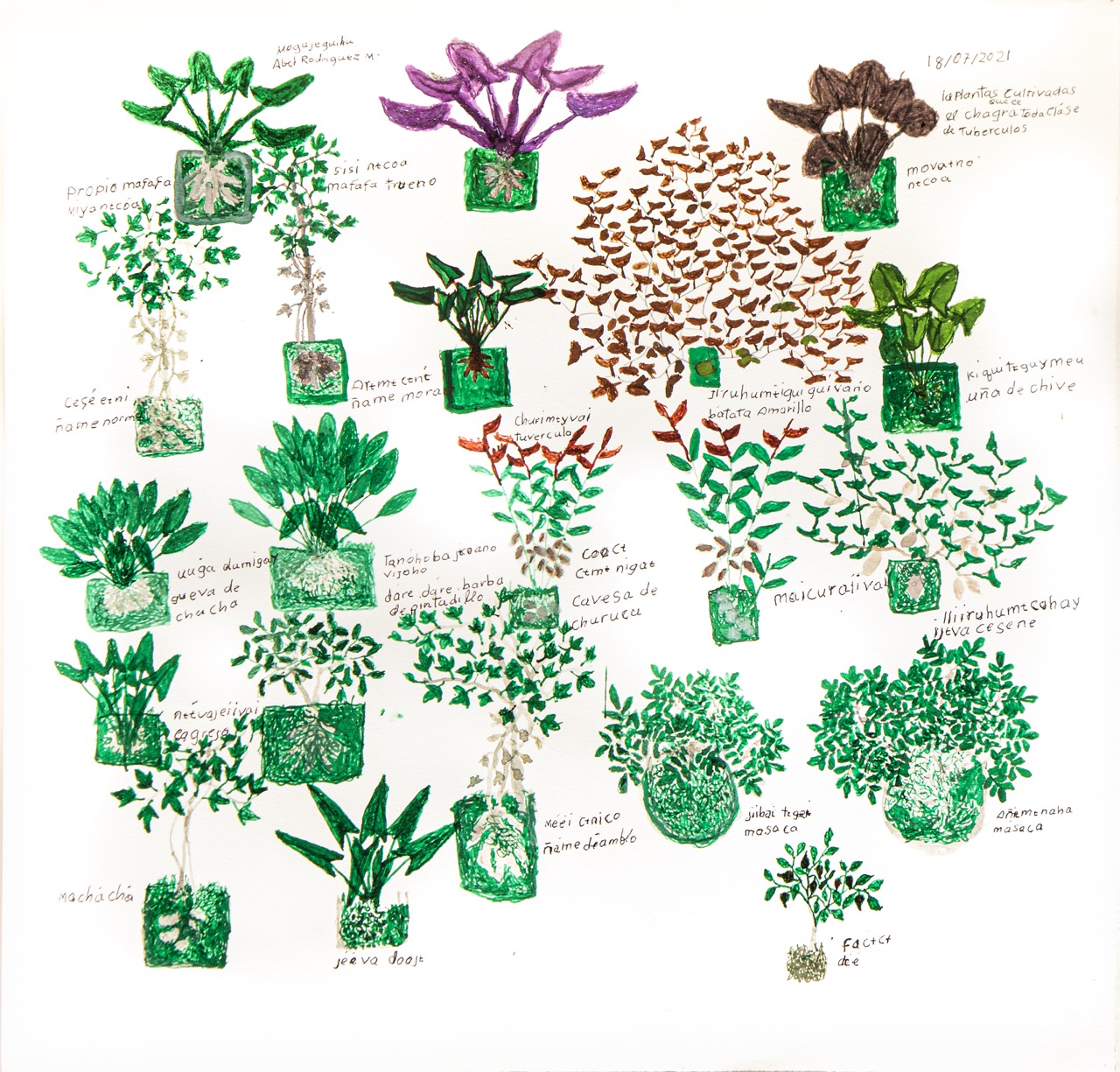 Also known as the "plant namer", Rodríguez has extensive knowledge of plants, animals and their ecological relationships, which he translates onto his distinctive ink paintings on paper. His knowledge, gained from close observation of the mamo (shaman), is not biological but tied to the energy and stories that began the world.