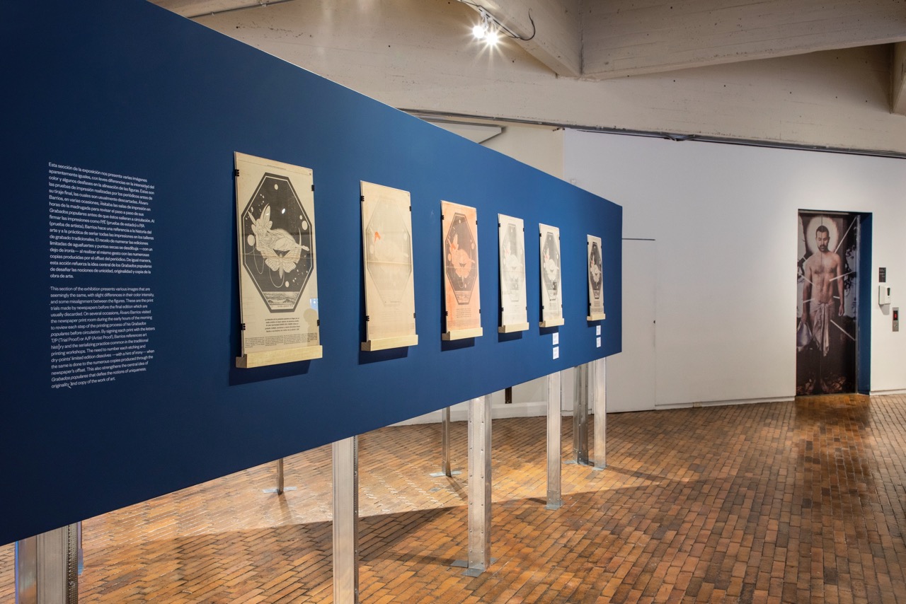 The exhibition spans Barrios's output from 1972 to the present, showcasing his broad repertoire, including offset, photogravure, lithography, and screen printing.