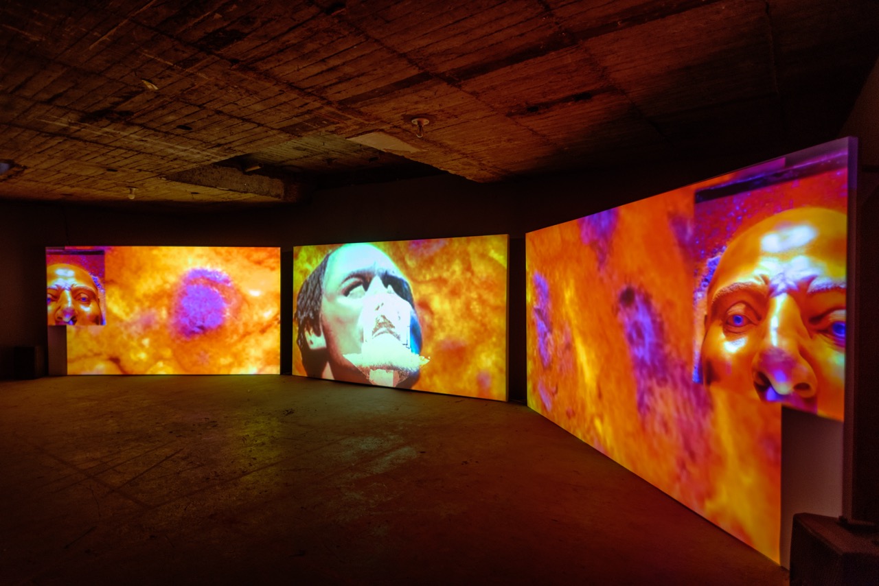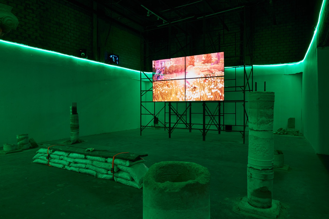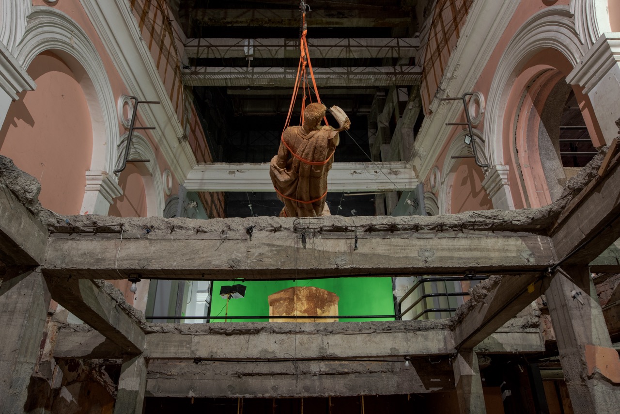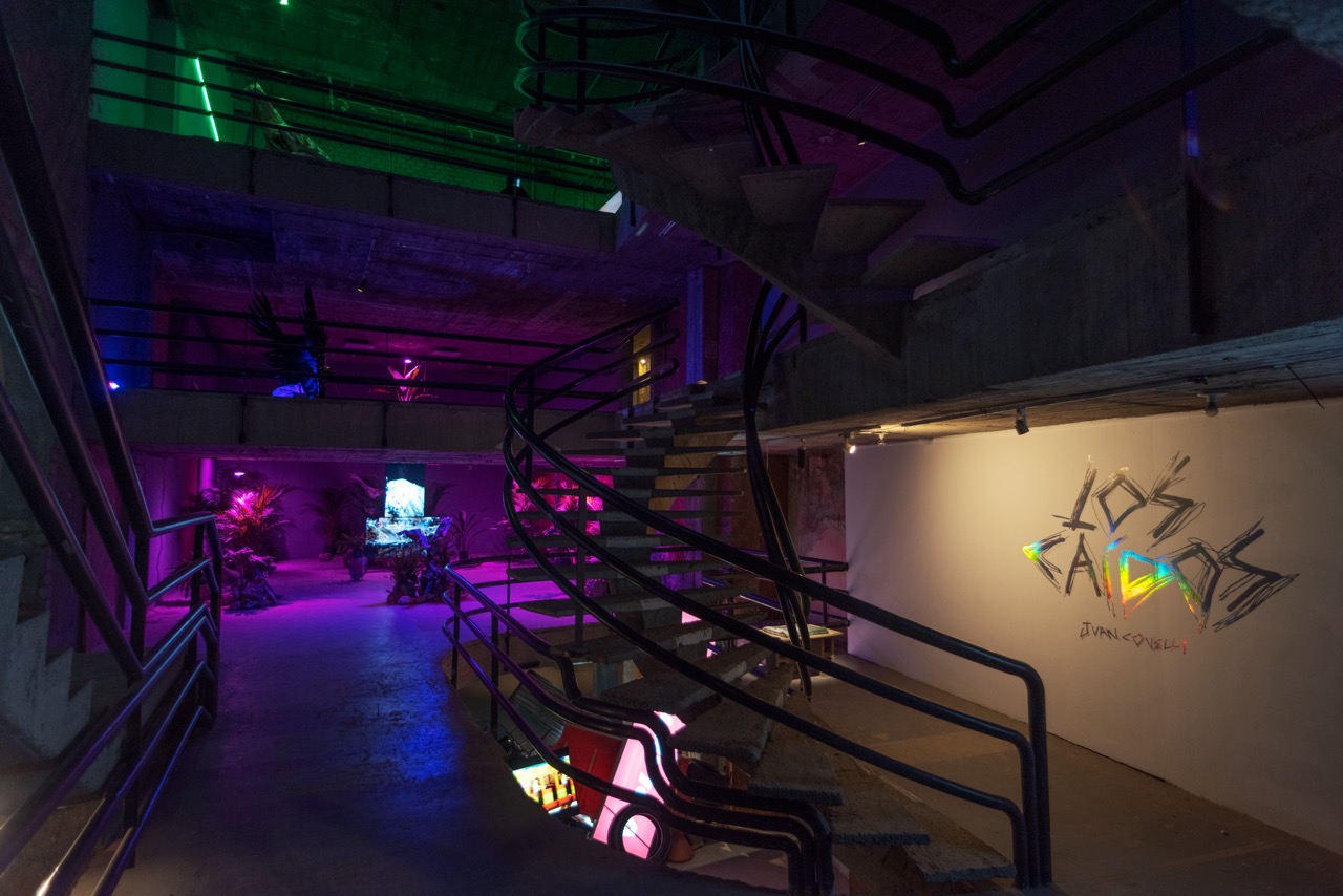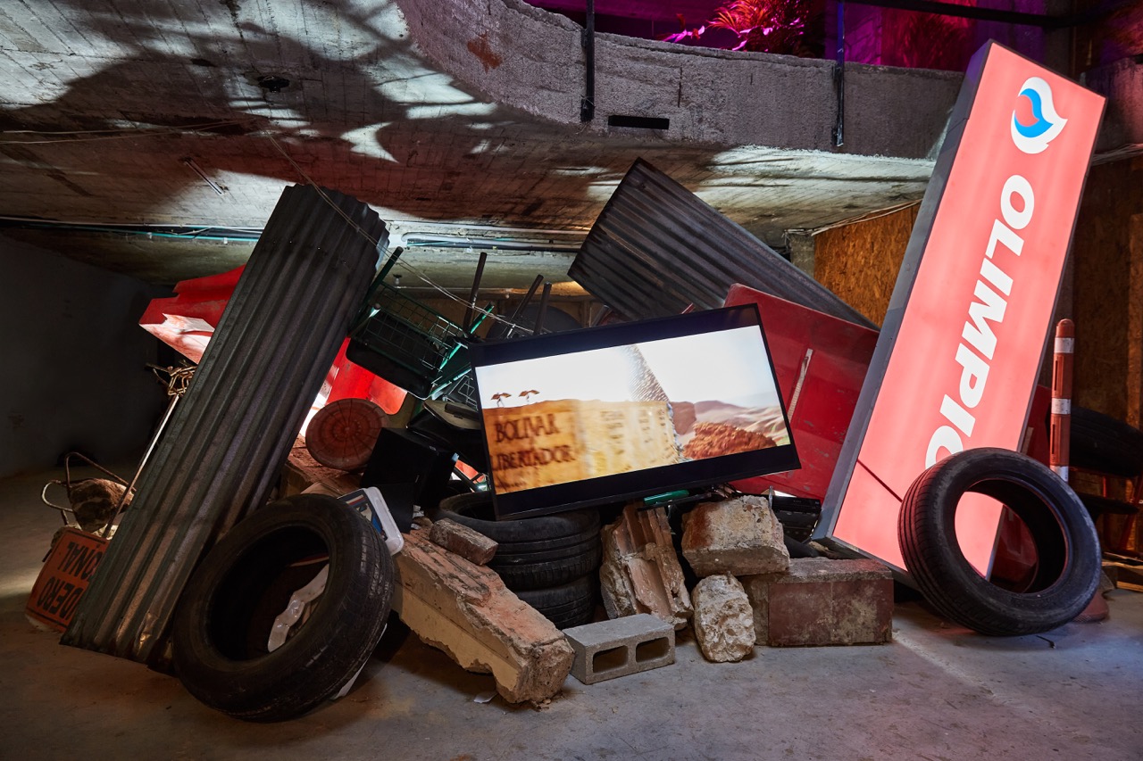 Los caídos [The Fallen] by Juan Covelli is a comprehensive multimedia installation spanning four floors of the Espacio Odeón, exploring polarities like ruin and regeneration, and virtuality and materiality. Ruin is presented as a political statement resulting from collective iconoclasm (like the 2019-2021 social uprisings in Colombia), evidenced by debris, a digital totem of the defunct Los Héroes monument, and a suspended earth sculpture. These ruins reflect the obsolescence of historical grandiloquence.
