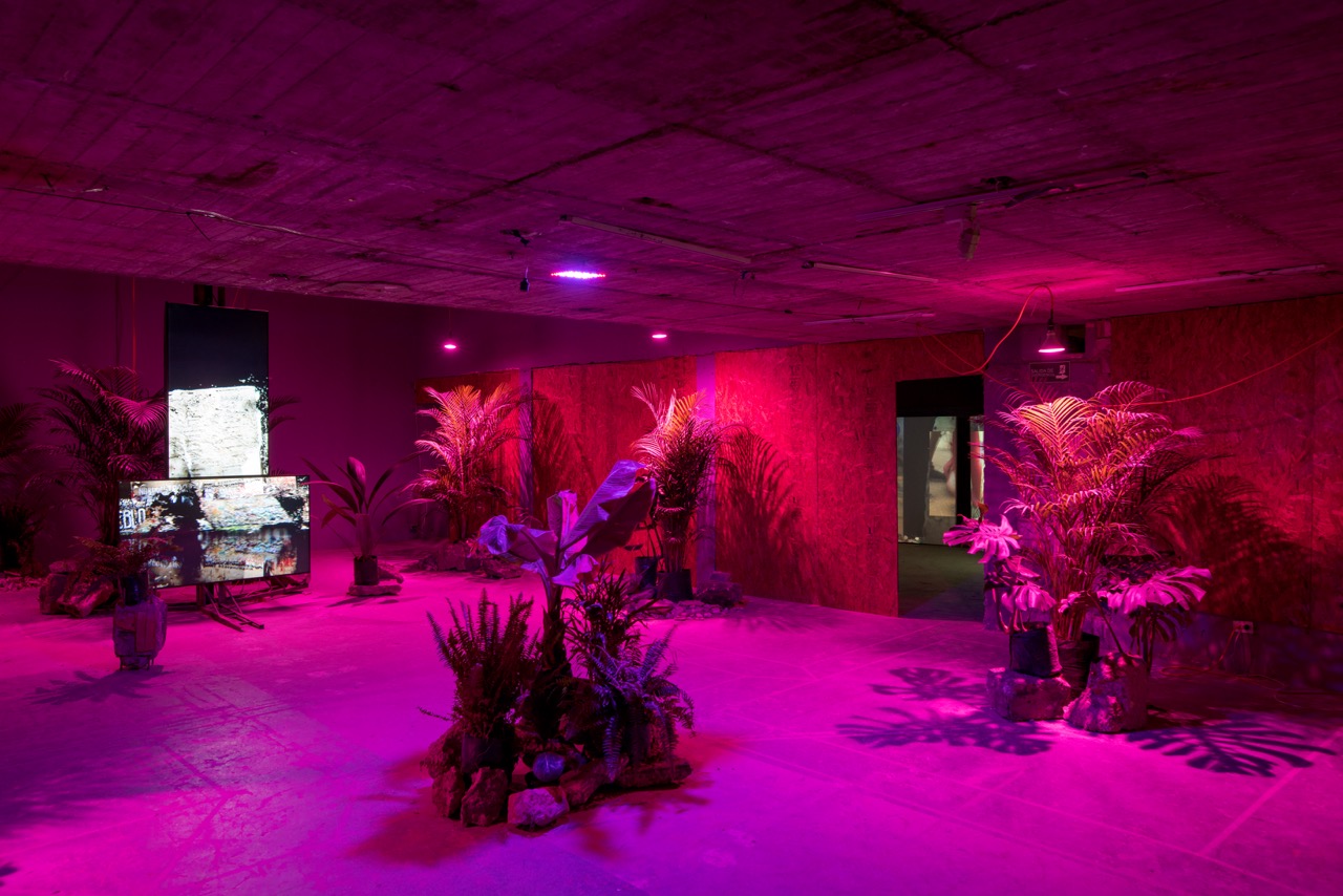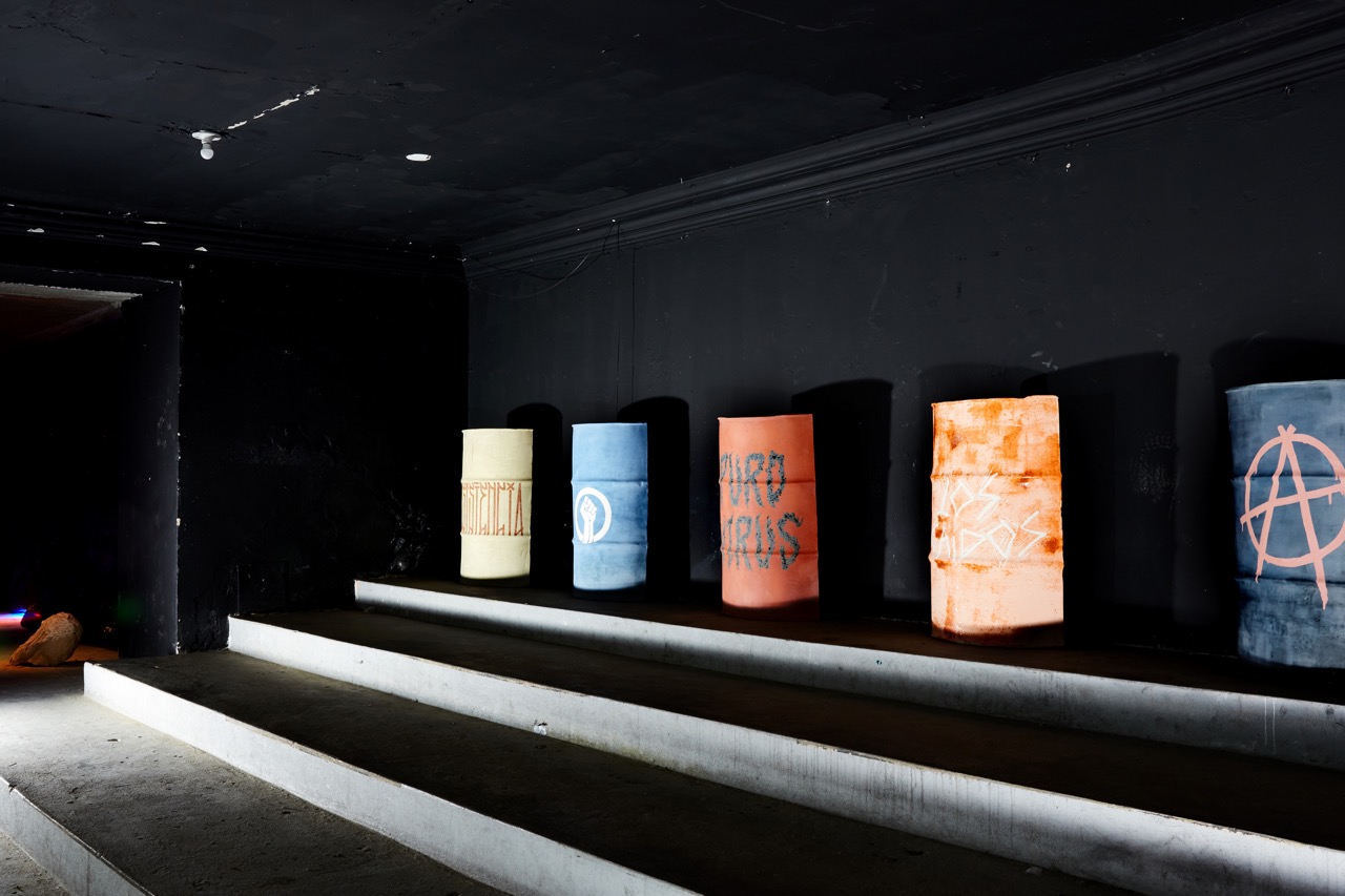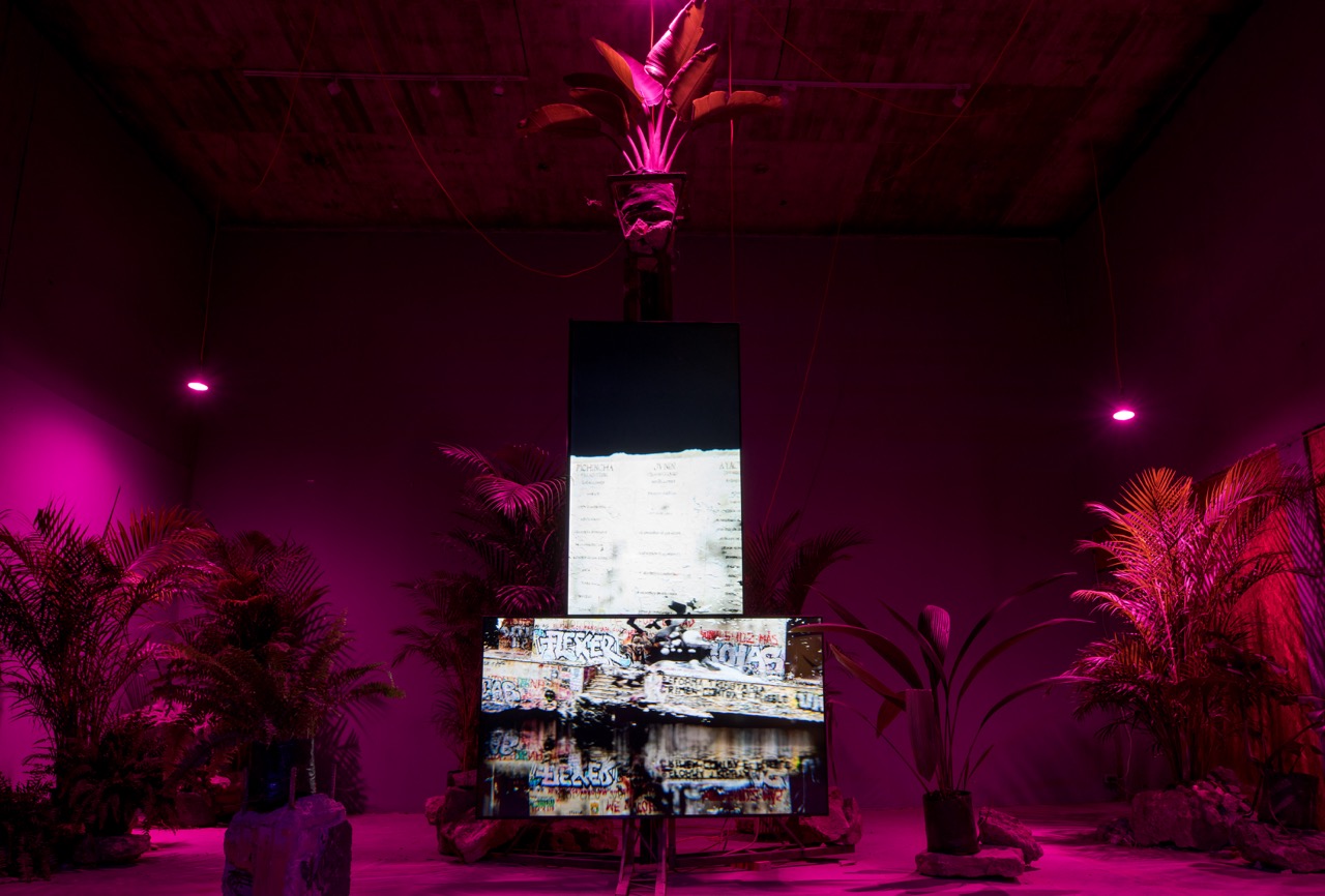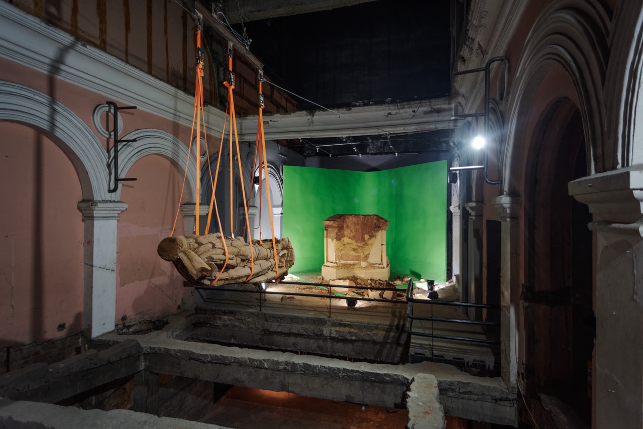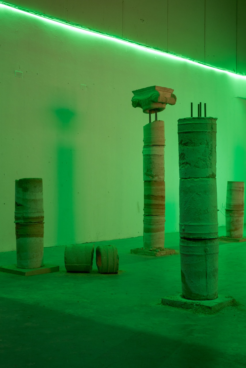 Los caídos [The Fallen] by Juan Covelli is a comprehensive multimedia installation spanning four floors of the Espacio Odeón, exploring polarities like ruin and regeneration, and virtuality and materiality. Ruin is presented as a political statement resulting from collective iconoclasm (like the 2019-2021 social uprisings in Colombia), evidenced by debris, a digital totem of the defunct Los Héroes monument, and a suspended earth sculpture. These ruins reflect the obsolescence of historical grandiloquence.