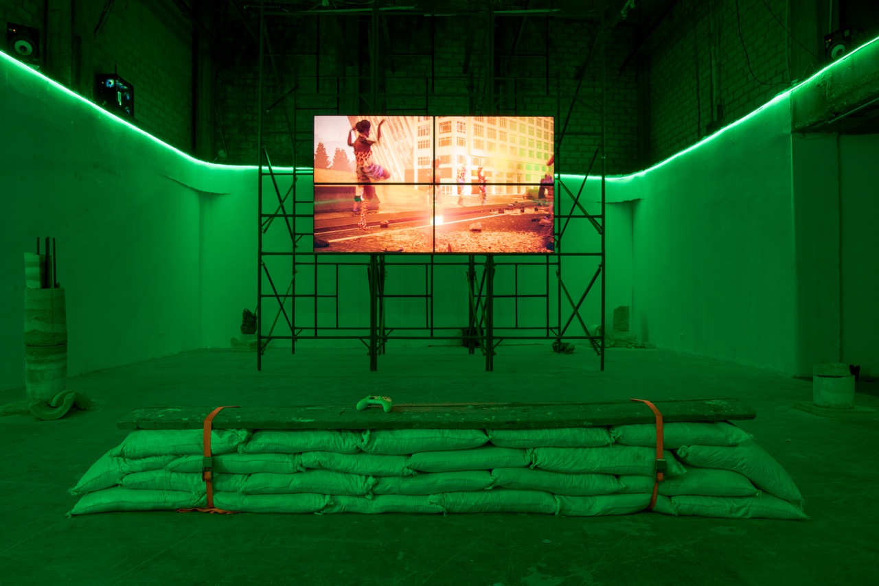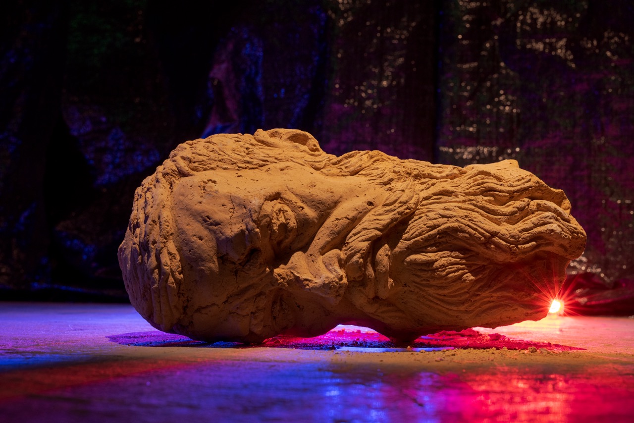 Memory is depicted as fragmented and malleable due to algorithmic "echo chambers" and the rise of Artificial Intelligence, which challenges the construction of a homogeneous truth. A sand pedestal interacts with a visual essay co-created with AIs to question the reliability of images and the possibility of collective idols in the post-truth era. As an alternative to monumentality, the canon must be malleable and horizontal. A video game serves as the centerpiece, proposing a cathartic, speculative space where characters like Captain Colombia, the ESMAD, a Misak Indigenous person, or a trans person consolidate as new identity benchmarks. Finally, regeneration follows ruin, where earth sculptures incorporating mycelium consume the fallen forms of the past to incubate new multispecies futures.